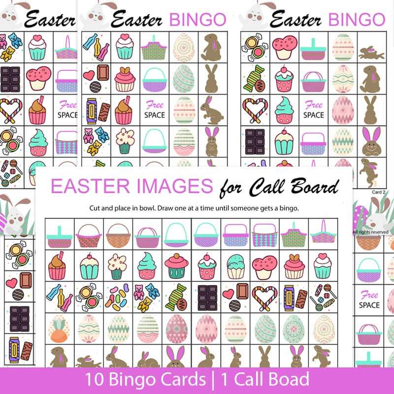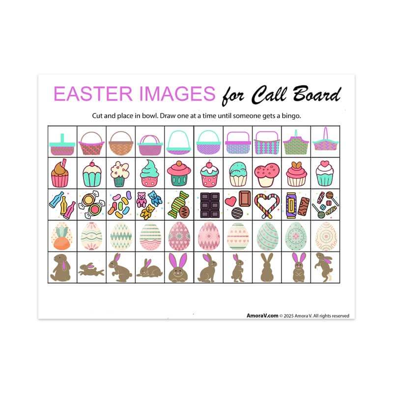 This delightful game features a vibrant call board and 10 uniquely designed bingo cards, each adorned with cheerful Easter-themed illustrations, including bunnies, eggs, and candy,