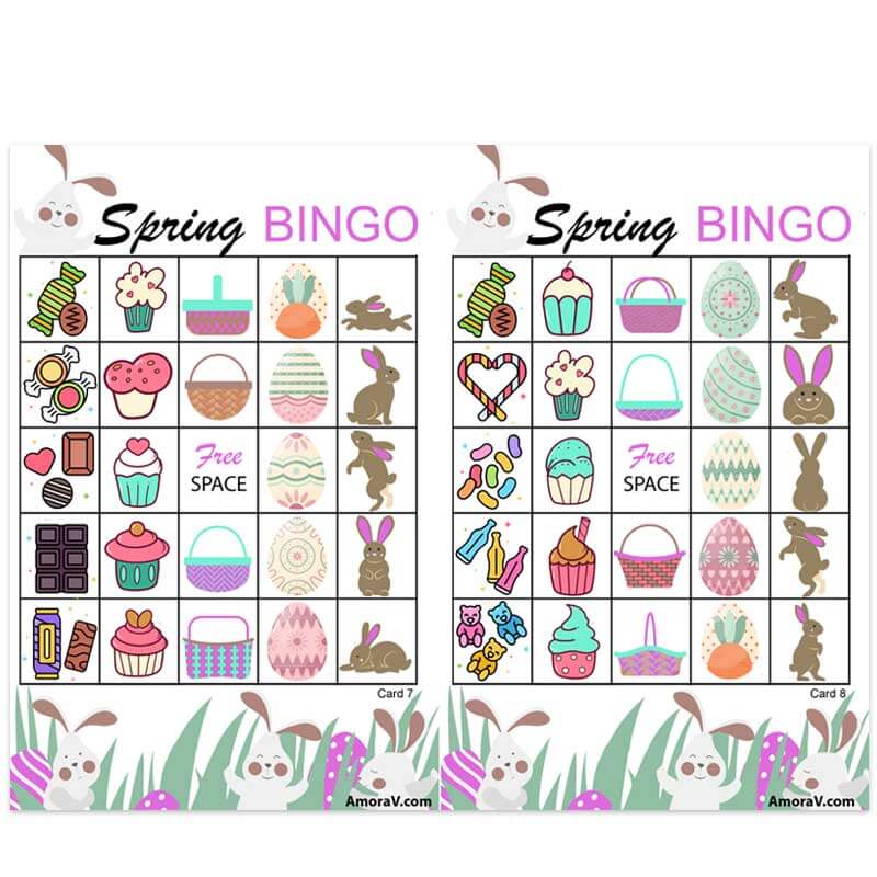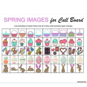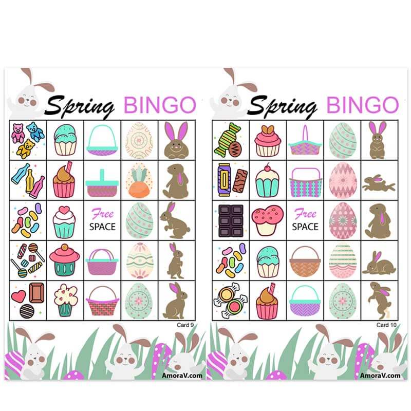 This delightful game features a vibrant call board and 10 uniquely designed bingo cards, each adorned with cheerful Easter-themed illustrations, including bunnies, eggs, and candy,